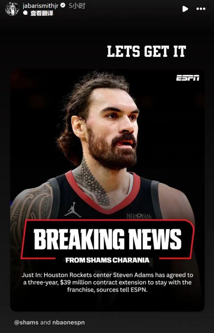 火箭签下亚当斯,就是在更衣室塞进个精神图腾,他的掩护墙是年轻球员最幸福的港湾,申京格林梦里都是他花岗岩般的肩膀,小史密斯在INS转发并祝贺道:“让我们冲吧