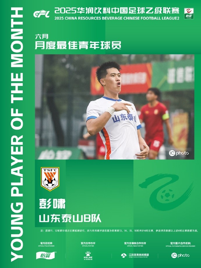 7月17日讯 中乙联赛官方公布了6月最佳球员和最佳青年球员奖项,均被山东泰山B队的彭啸获得。
